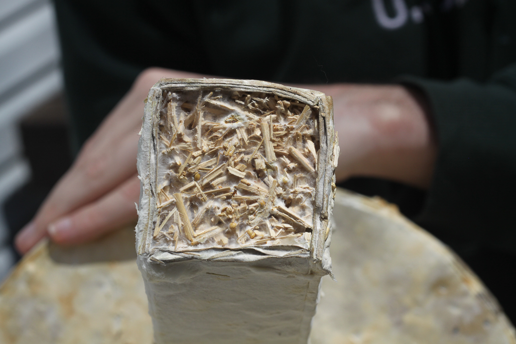 In this collaboration, we applied the results of tests TILE_10_CB and STRCT_V_WPLA1 to create a stool. Jasper designed a stool in Fusion360 and then used a Grasshopper script and Rhino 7 to create perforated nets to be laser-cut. Embedding mycelium and laser-cutting processes allow for quick and low-cost prototypes. Once the “mold” for the stool was cut and assembled, it was packed with hemp hurds innoculated with oyster mushrooms. Using a cardboard mold allows for the mycelium composite to integrate the rigidity and structure of the mold into the final object. Like all our other experiments, this stool is alive. In order to make the stool stronger, we desicated the mycelium in our home oven.