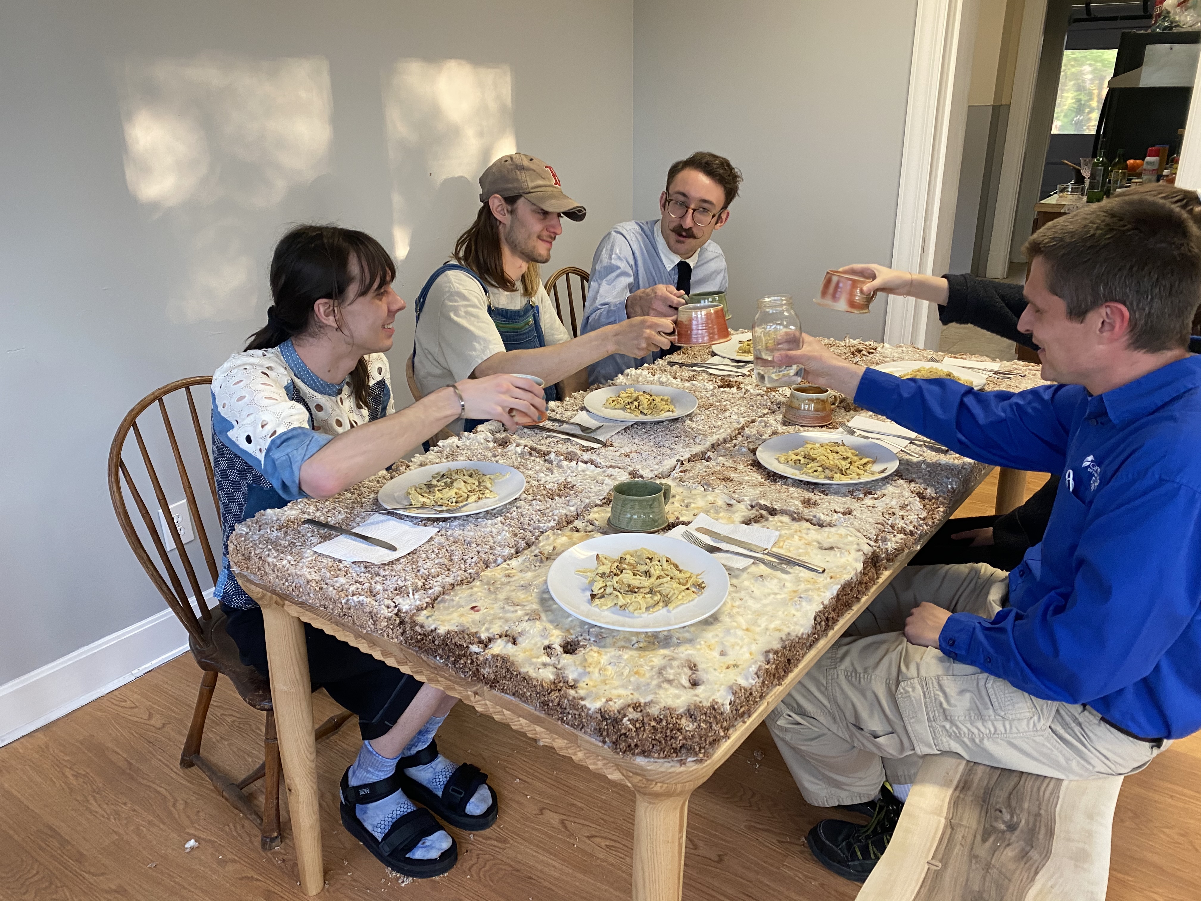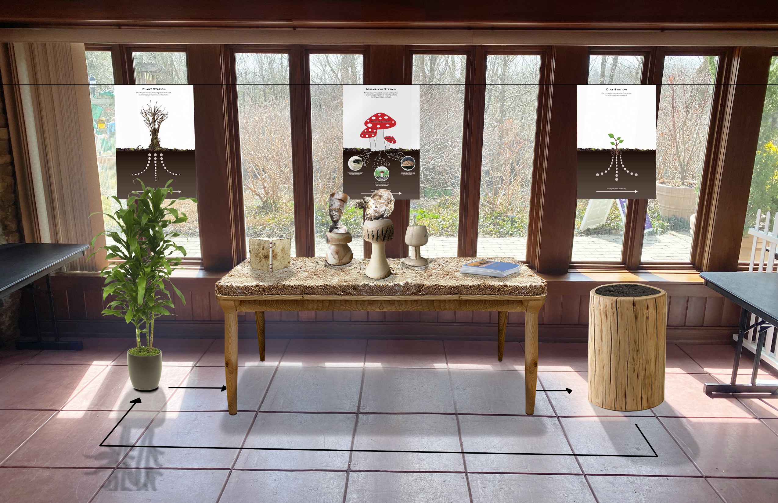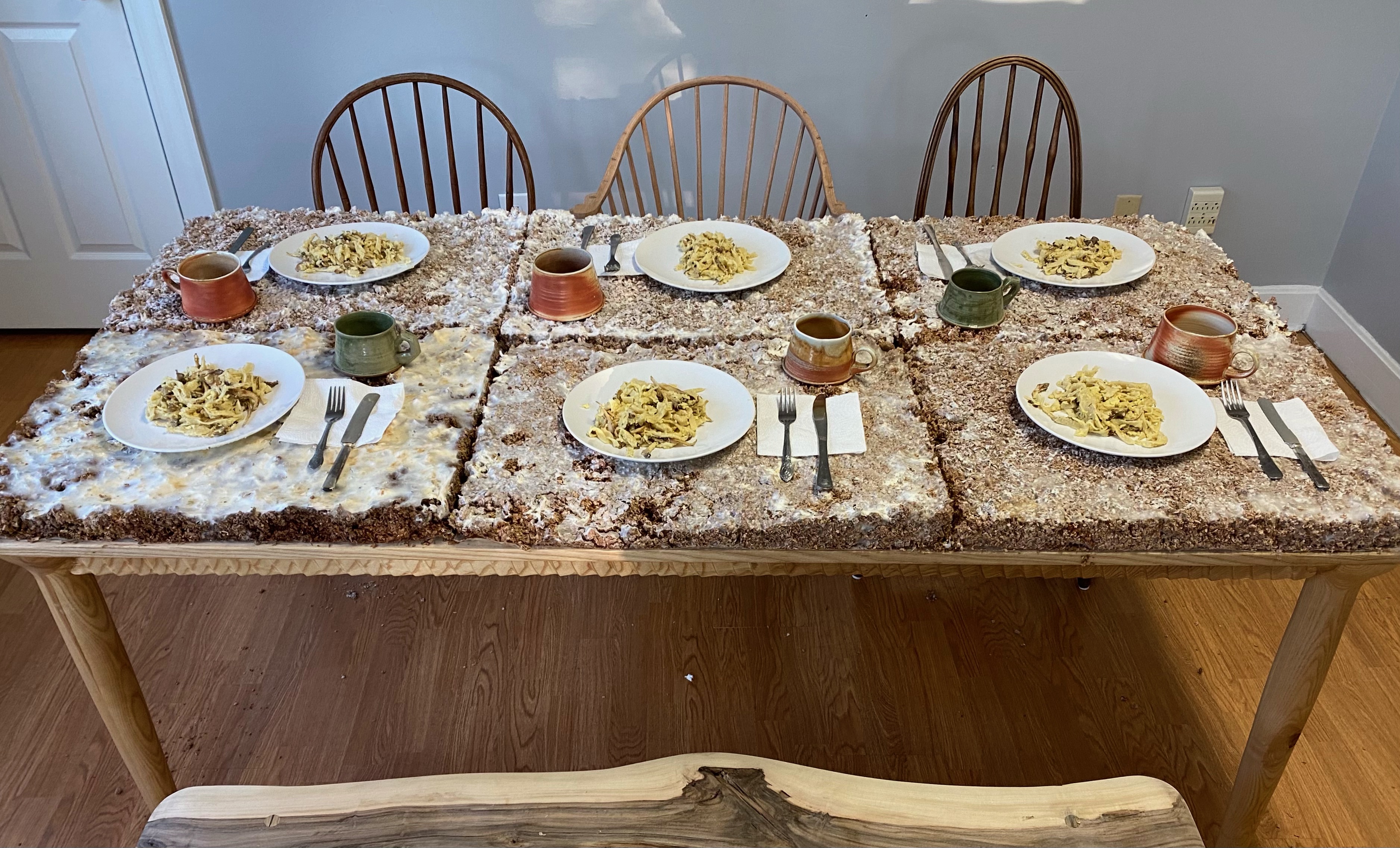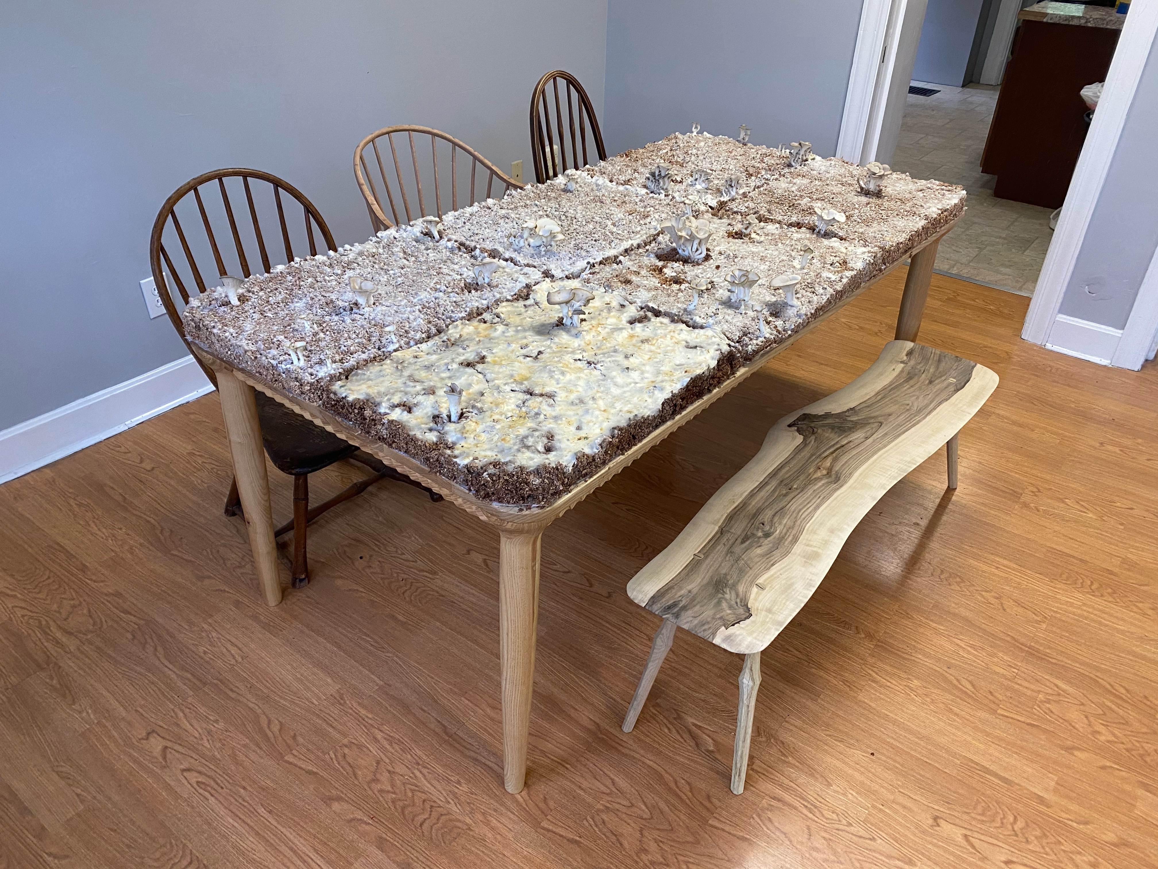 Along the way, Joe found a context for this table by partnering with the Great Parks of Hamiliton County. Following the experiential dinner, the table and mycelium would be donated to Glenwood Gardens. He designed and planned an exhibit shown in Glendwood’s Visitor Center as an educational showcase of mycelium. Mycopedia greatly admires this outreach and public showcasing of mycelium, and supplied several of our tests and artifacts for the exhibit.