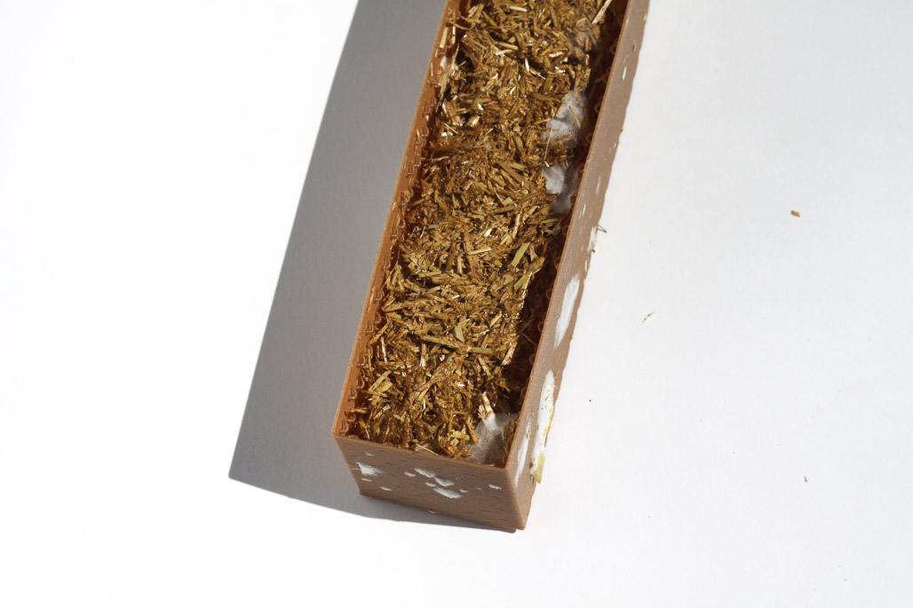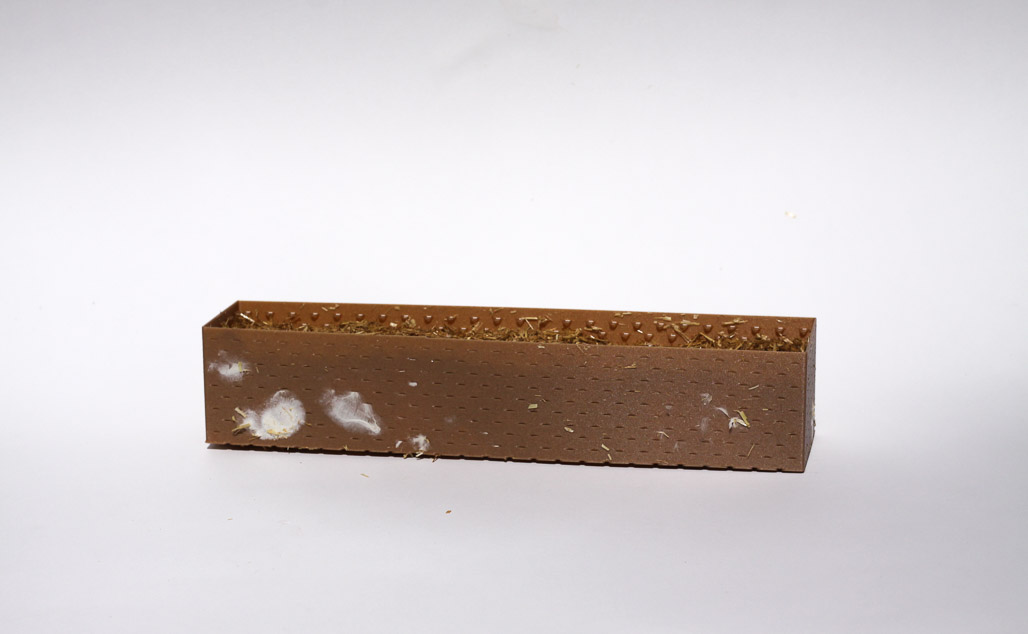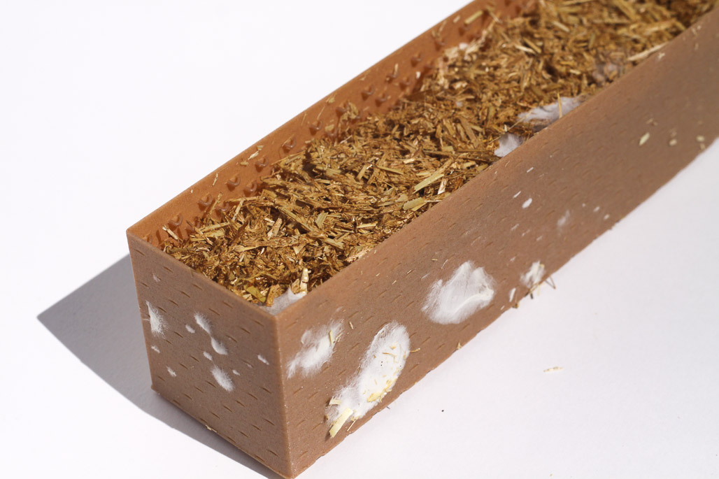Notes: In this attempt to use a perforated WPLA print to create structure, there was little growth. Too much of the straw was exposed to the air, which led to contamination and little growth.