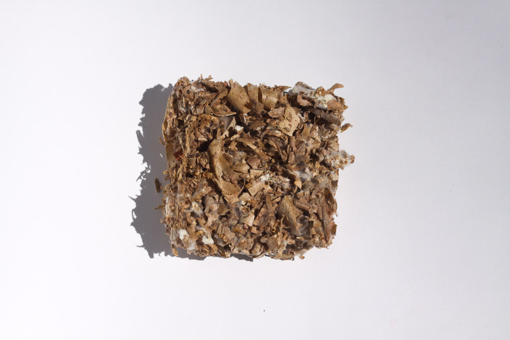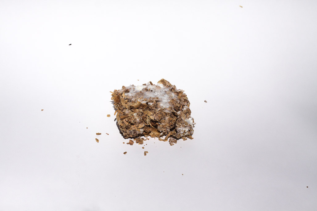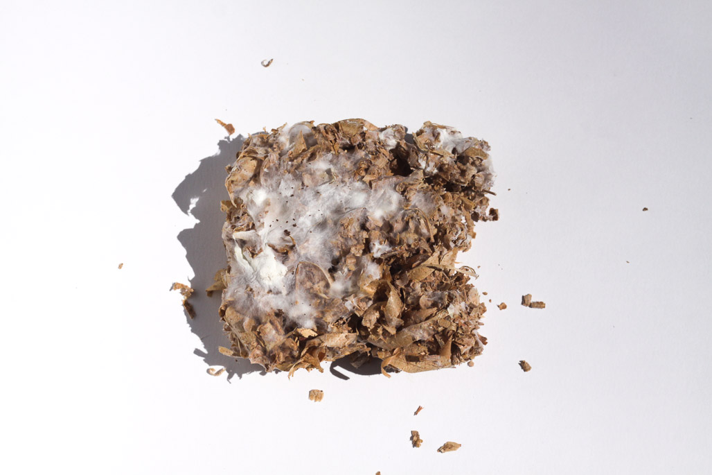 Notes: This mixture contained too large of a variety of particle sizes. The tile was too dense for strong growth around the sawdust, and too light from woodchips to have structure.